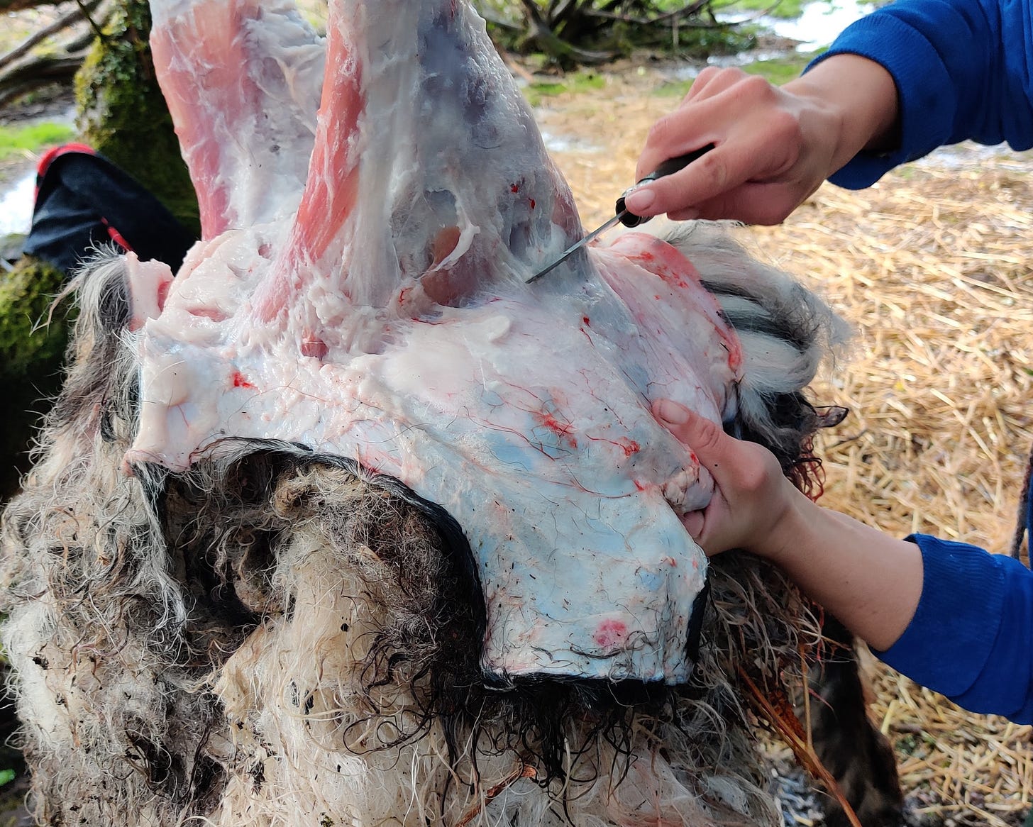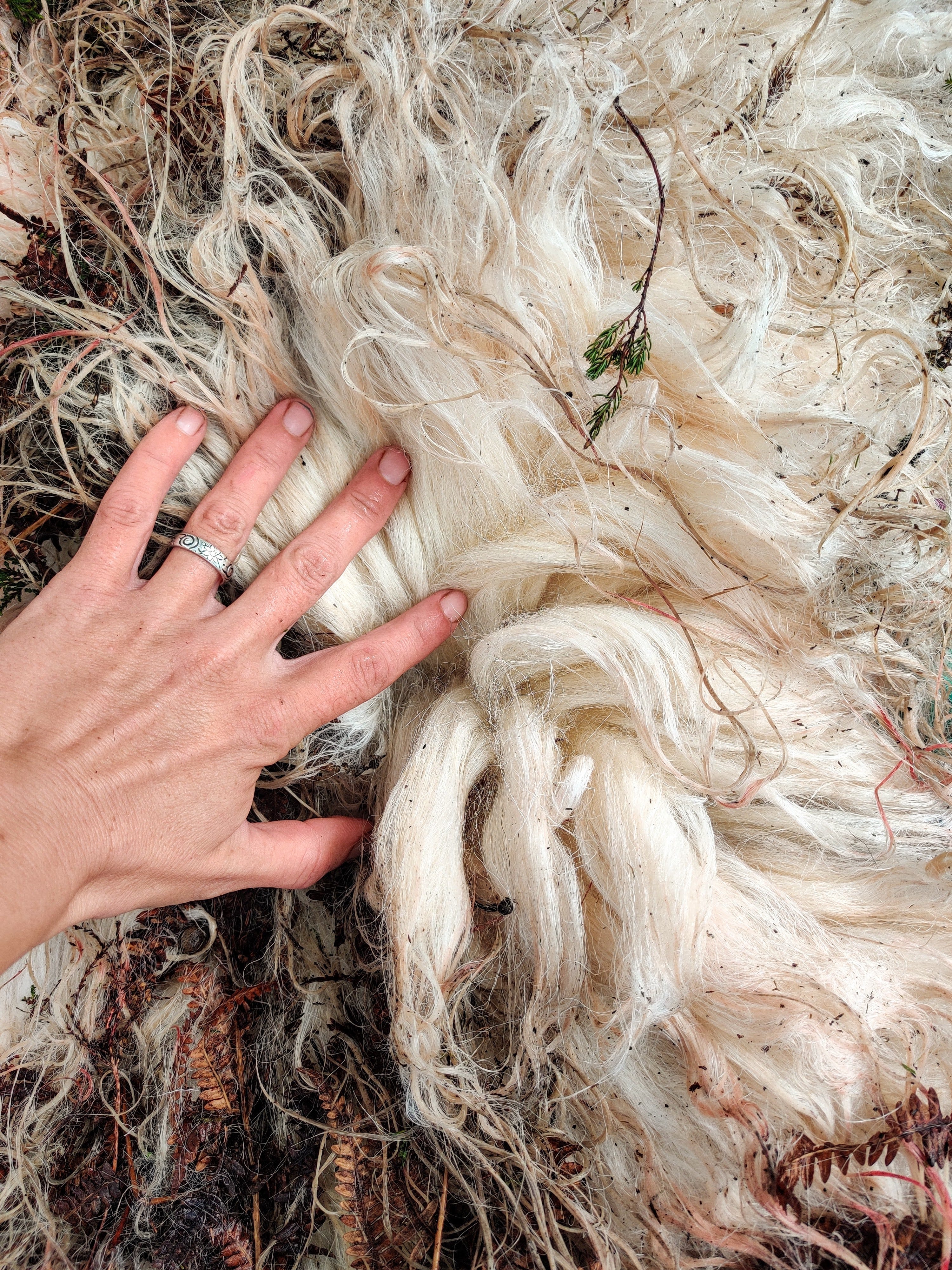 Skin doesn’t separate easily from cold flesh. Membrane and fluids dry as the body cools and stick skin to flesh like glue. Woven fibres tighten as muscle sets in rigor mortis. It was November. It was our first winter living wild on the Hill and I worked on that cold, dead sheep through freezing rain showers and bitter wind under the sparse shelter of bare willows until my fingers were numb. I saved her pelt. I rolled it up into a black bag and stuffed it into the freezer in storage where it waited in frozen perpetuity until now, almost three years later.
