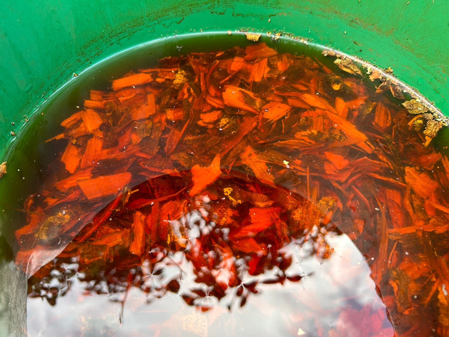 I read somewhere from a study by people who measure these things that the tannins in oak bark increase from spring through summer, long after the sap has risen. Young bark is best, peeled in thin strips from the smoothest limbs. On fast-growing willow, I look for three to five year old growth; on our two-hundred-plus year old fallen oak, by rough count of growth rings the branches I’m stripping first are twenty to fifty years old. But I will also chip thicker bark from older boughs with a hatchet for the sake of quantity. I strip bark until my back aches and my blade begins to slip and the chores of the late day call. It’ll have to be enough, I tell myself, but I know it won’t be, by the time I’ve hand-shredded it and peeled away the excess wood. It takes a lot of bark to turn skin into leather, and stripping bark is slow, laborious work. I measure the tannin content of my harvested bark brewed up into buckets of red, woodsy tea by good old-fashioned taste test. Tannins are bitter and drying, astringent. Think unbearably strong black tea, biting into a sloe, or a bitter medicine your great-grandmother might have made. The more drying, the more your throat and taste buds cringe from the astringency and bitterness, the better. Depending on strength, it could take a week or a month or a year for the tannins to penetrate and work their alchemy through the full thickness of the hide. Our native oak is mild. Its flavour is earthy, mossy, bitter, slightly puckering. It’s going to take a while.