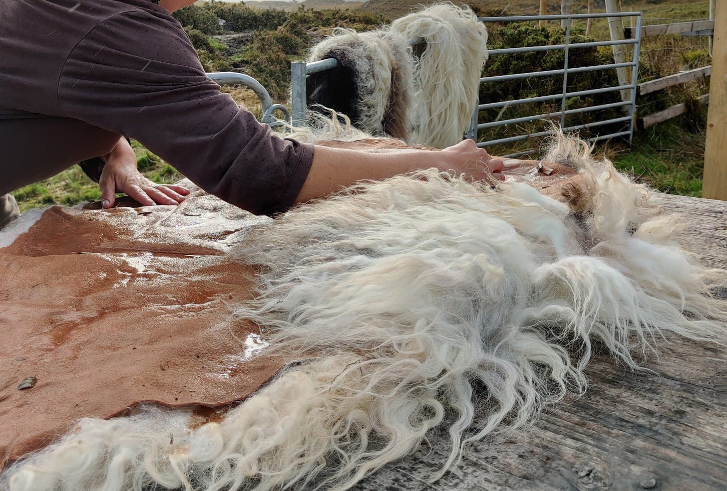 Gizmo, the kid with a pelt like black satin, who ran his mother ragged. Fíonn, the handsome ram who turned bad. Sweet little Froggy who only wanted to be our pet, but we just can’t keep them all. Ah, beautiful Brigid, the wildest and fattest ewe lamb there was with the thickest, heaviest fleece that was her literal downfall. I noticed her the day before I found her dead, sitting on her brisket on the rocks where she always sat, chewing her cud, waiting for her mother ewe, the one we called Big Trouble, to come home from whichever neighbouring field she shouldn’t have been in that day. I noticed her as though something was wrong. As though a shadow passed over her. As though something whispered watch that one. Something that made the hairs on my spine stand up. I couldn’t see anything wrong with her, chewing her cud, relaxed, waiting, so I resolved to come back and check her again later. But then I was called away to deal with an emergency with the lowland sheep and I didn’t get home to the Hill until after dark. When I found her the next morning she had rolled off her perch on the rocks onto her back and hadn’t been able to get up again, held there by the weight of her rain-drenched fleece until the pressure of her belly full of heather on her lungs killed her. That happens frighteningly often to sheep. But I couldn’t have known it would happen to that fine, strong ewe lamb that day. I wasn’t going to let the Hill have Brigid’s precious pelt of eight inch long, chalky-white locks grown of heather and shale and rain and all the effort and care we put into breeding and raising such a beauty, so I hauled her heavy, stiff body into a wheelbarrow and up across rock and heath to the willow grove, roped her dead weight to a generously arched branch and set to work to separate skin from cold flesh.