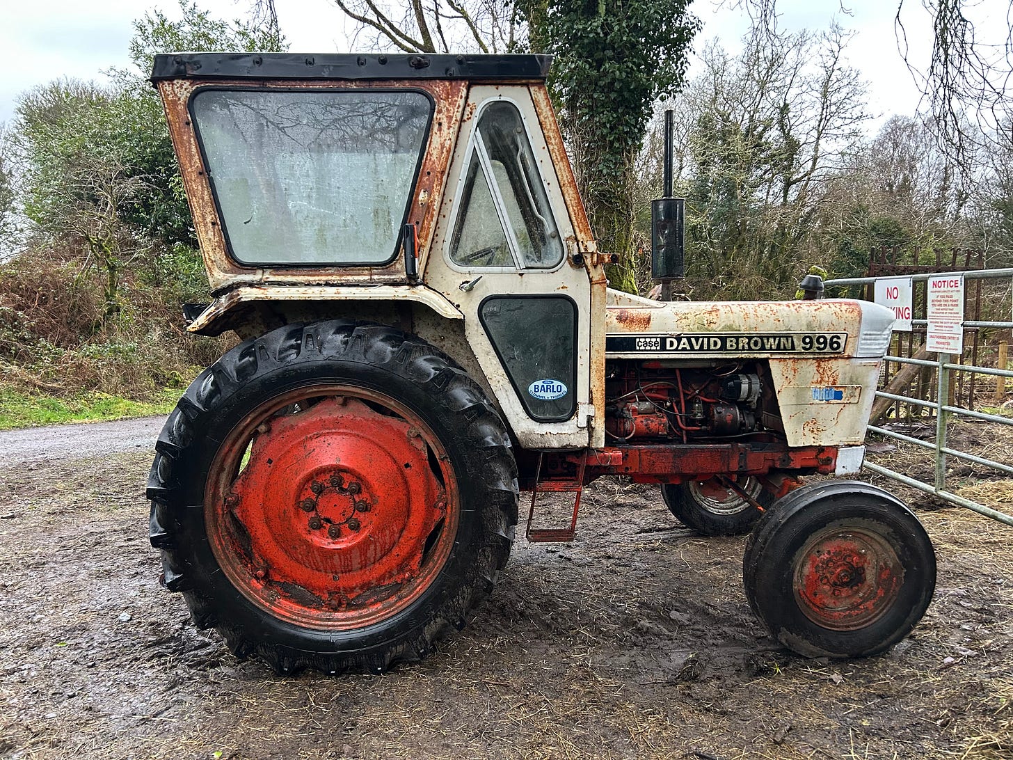 Besides bringing our own haylage bales down to the winter feeding yard, he’s had old David Brown carry pallets, fenceposts, rolls of galvanised sheep wire and 50kg bags of granular lime to where they’re needed around the farm—all the heavy, donkey work that we would have laboriously used our own backs for and left ourselves too beaten to actually complete the jobs we set out to do. Funny how I still can’t shake the need to justify burning a couple of litres of diesel to save our backs and free our time and human strengths for more productive endeavours in the work of growing food and fibre and making a living on the land while the world continues to drop bombs and build energy guzzling data centres. While we all, myself included, think nothing of taking out the car for every little errand. We might even be able to cut and bale our own (small, human-scale bales of) hay with this light little tractor that barely leaves a track, ultimately cutting out a lot of the trucking in of winter feed by contractors with massive machines and aiding in our efforts toward the more closed loop and localised system we’re aiming for.